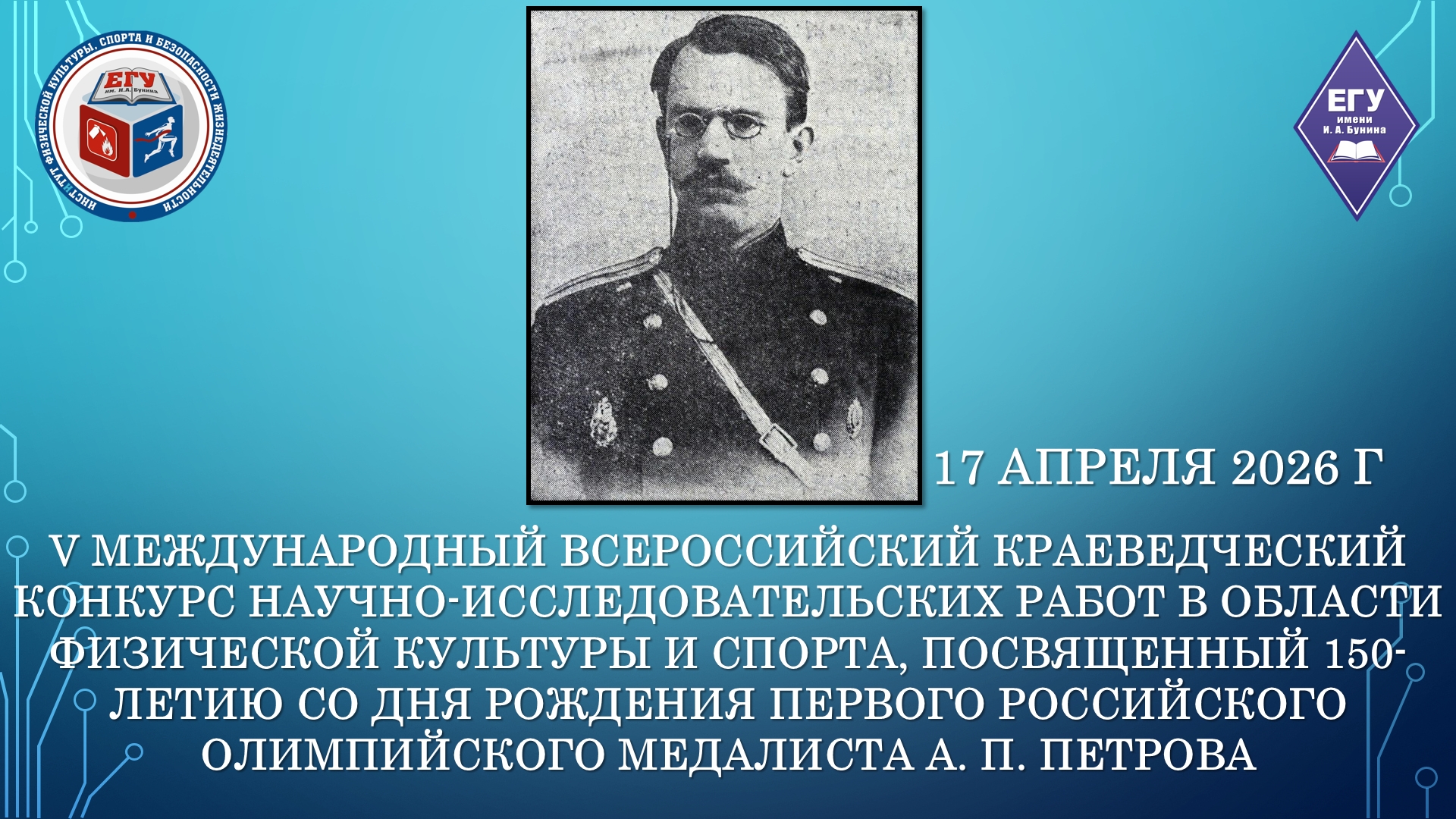 Институт физической культуры, спорта и безопасности жизнедеятельности ЕГУ им. И.А. Бунина проводит IV с международным участием Всероссийский краеведческий конкурс научно-исследовательских работ в области физической культуры и спорта, посвященный 150-летию со дня рождения первого российского олимпийского медалиста А. П. Петрова
